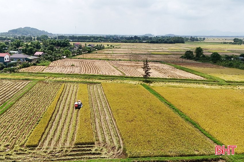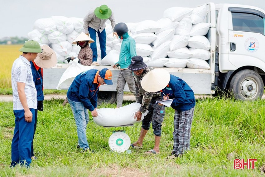 Trên xứ đồng Chăn Nuôi của thôn Bình Quang, xã Cẩm Bình (Cẩm Xuyên), máy gặt đập liên hoàn đang chạy phăng phăng thu hoạch những hạt thóc vàng óng, chắc mẩy. Lúa thu hoạch đến đâu, Công ty cổ phần Hòa Lạc IEC (Thạch Hà) thu mua đến đó với giá 9.000 đồng/kg (cao hơn các loại lúa sản xuất truyền thống 2.500 đồng/kg - PV) khiến bà con nông dân phấn khởi.