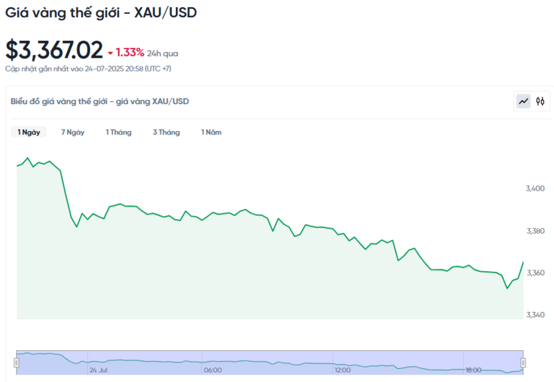 Giá vàng thế giới hôm nay 25/7/2025 và biểu đồ biến động giá vàng thế giới 24h qua