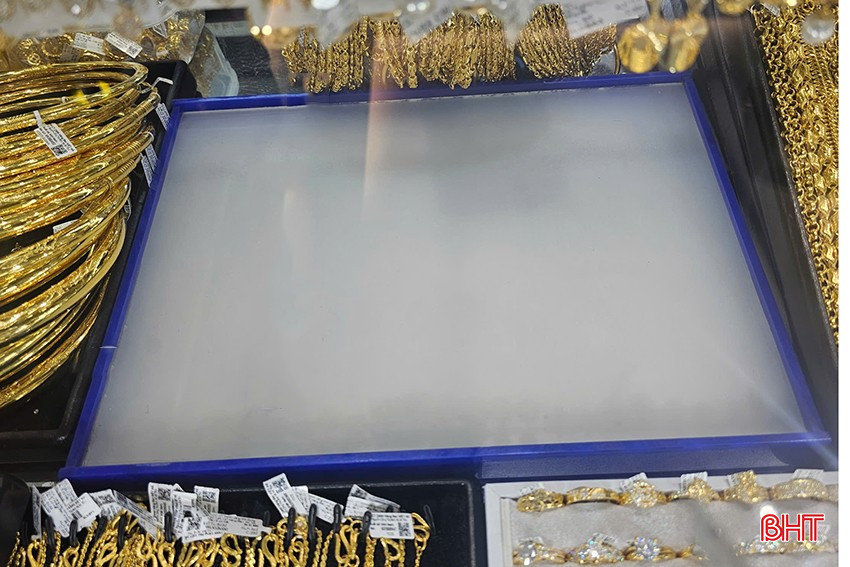 Tại tiệm vàng Việt Hà (đường Nguyễn Công Trứ, TP Hà Tĩnh), từ 9h thì mặt hàng nhẫn tròn đã hết sạch, không còn có để bán cho khách. Trong ảnh: Khay đựng nhẫn tròn của Tiệm vàng Việt Hà đã sạch trơn từ sáng 21/4.