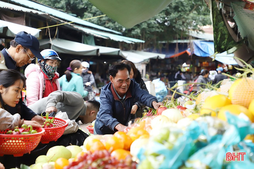 Tại các sạp hoa quả, khách ra vào liên tục. Các loại quả phục vụ cúng lễ như: chuối, bưởi, cam, quýt, táo, thanh long… được bày bán phong phú. Theo tiểu thương, giá hoa quả năm nay cơ bản ổn định, không có biến động lớn; lượng người mua trong chiều 22 và sáng 23/12 âm lịch tăng gấp 2-3 lần ngày thường.