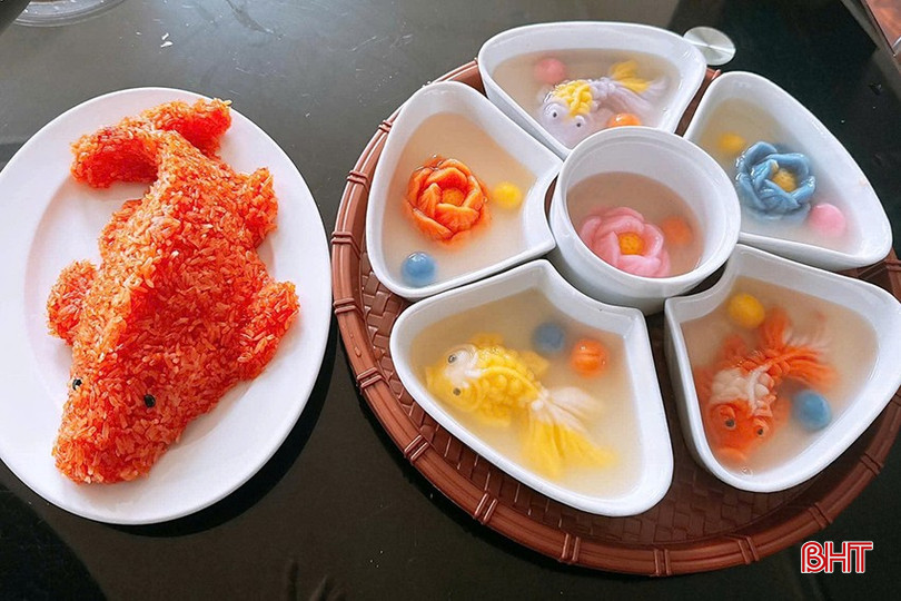 Các sản phẩm như thỏi tiền, cá chép làm từ thạch, bánh bao, xôi gấc… được bày bán có giá dao động từ vài chục đến vài trăm nghìn đồng/set. Với hình thức đẹp mắt, phù hợp lối sống hiện đại, các sản phẩm làm sẵn này được nhiều người chọn mua để dâng lễ.
