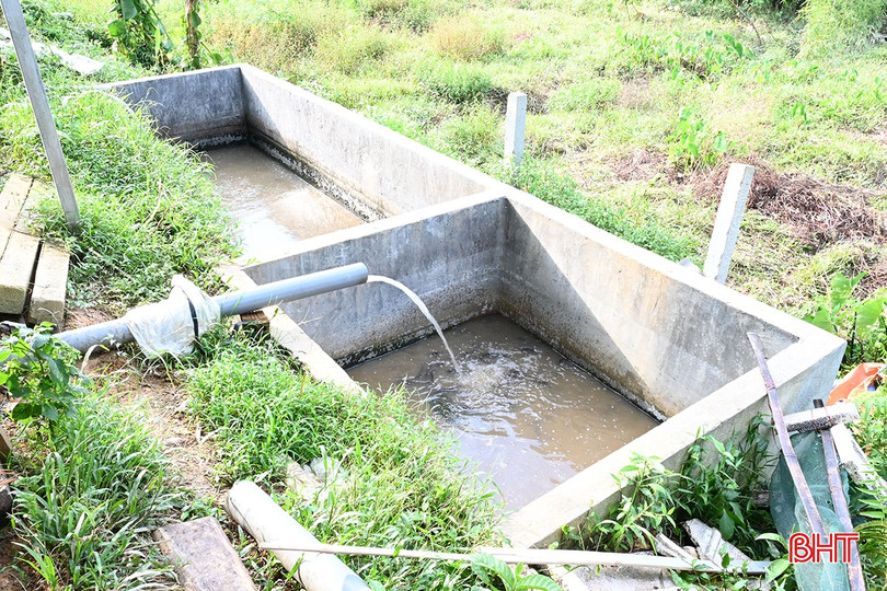 Gia đình sử dụng bể lắng, lọc nước thải (có nuôi cá để thử độ sạch) trước khi thải ra môi trường.