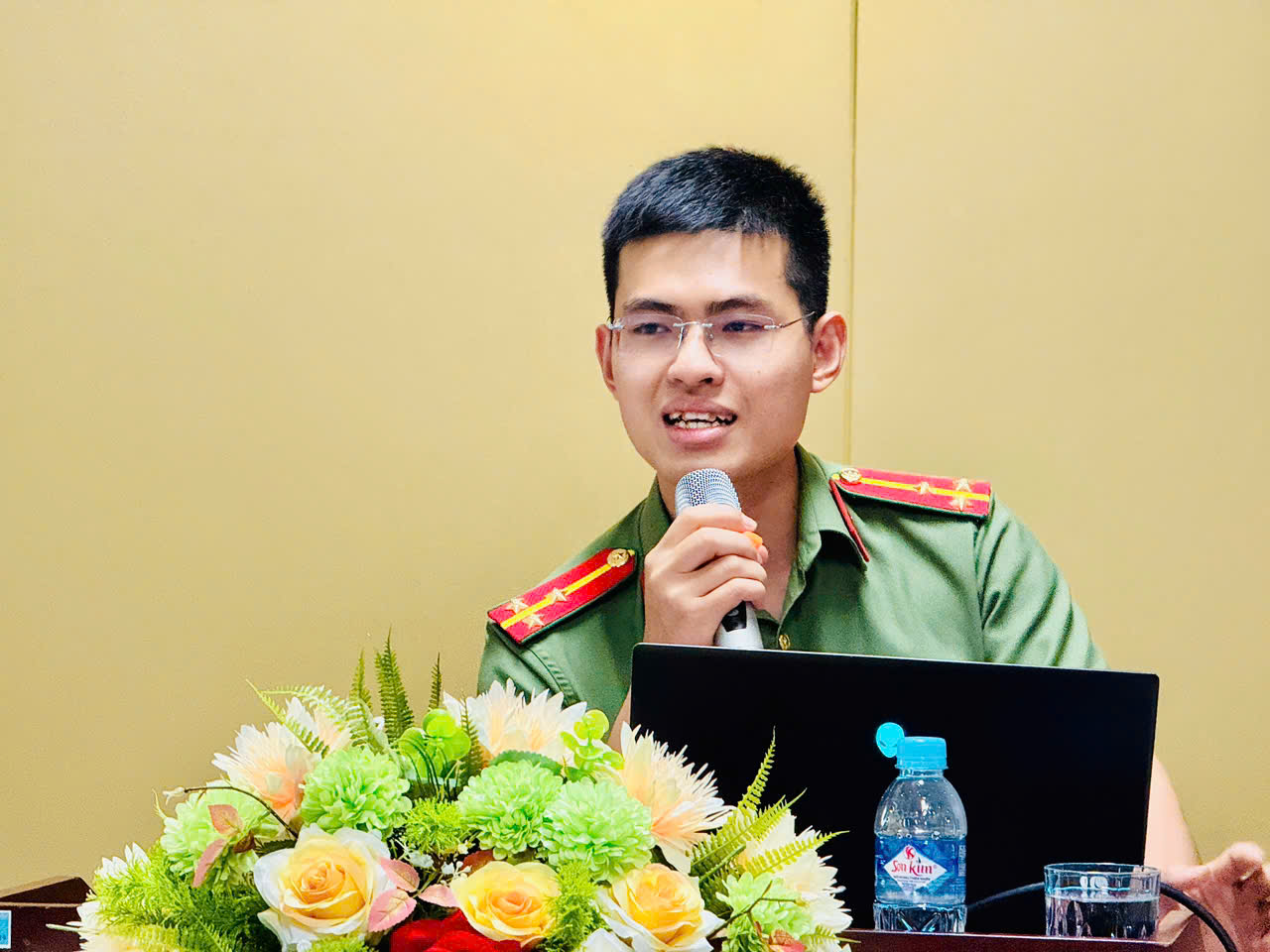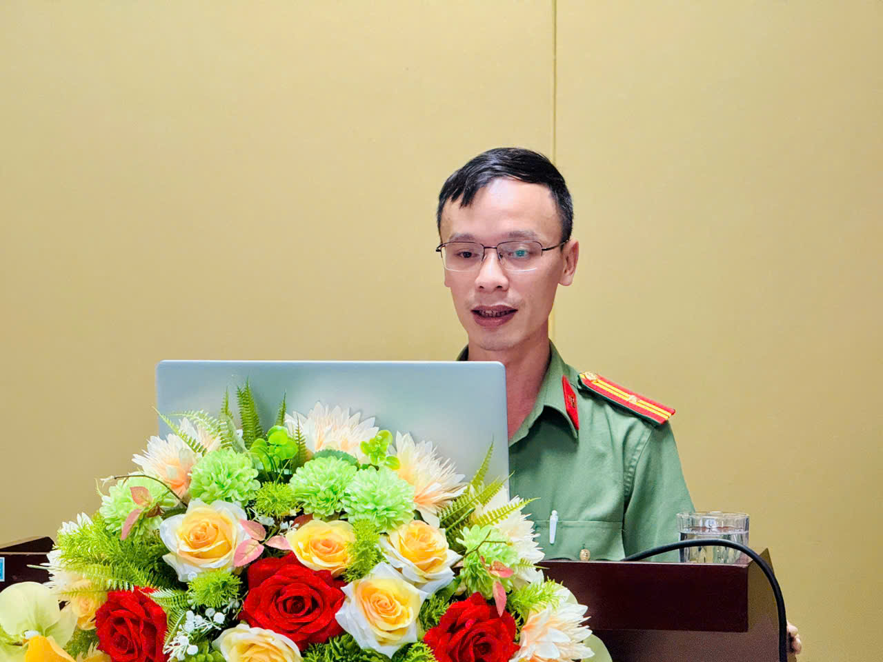 Đ/c Thượng úy Phạm Minh Hiếu trình bày Công tác đảm bảo an ninh, an toàn thông tin mạng trong các cơ quan nhà nước.